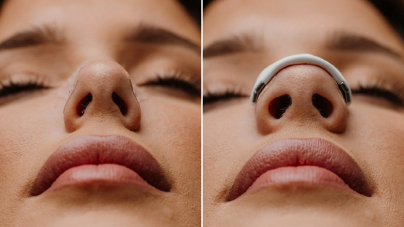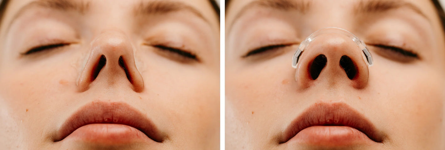 BreatheWays bestaat uit een lichte neusclip met magneten, en twee kleine plakkers (tabs) die je op je neusvleugels aanbrengt. De magneten trekken elkaar aan en openen je neus subtiel van buitenaf – zonder druk, zonder pijn.